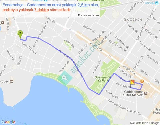 Fenerbahçe - Caddebostan arası yaklaşık olarak 90 km/h ile yukarıda belirtilen sürede olup, iki yerin kuş uçuşu uzaklığı (mesafesi) 2'dir. Yolculuk otobüsle 9 dakika sürmektedir.