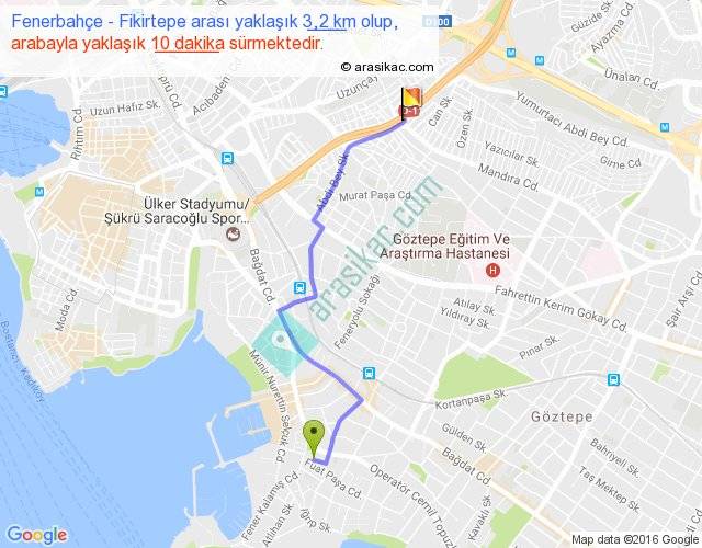 Fenerbahçe - Fikirtepe arası yaklaşık olarak 90 km/h ile yukarıda belirtilen sürede olup, iki yerin kuş uçuşu uzaklığı (mesafesi) 2'dir. Yolculuk otobüsle 13 dakika sürmektedir.