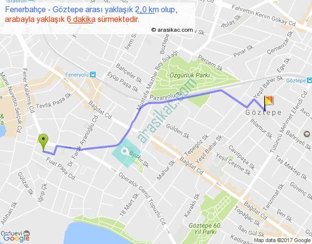 Fenerbahçe - Göztepe arası yaklaşık olarak 90 km/h ile yukarıda belirtilen sürede olup, iki yerin kuş uçuşu uzaklığı (mesafesi) 2'dir. Yolculuk otobüsle 7 dakika sürmektedir.