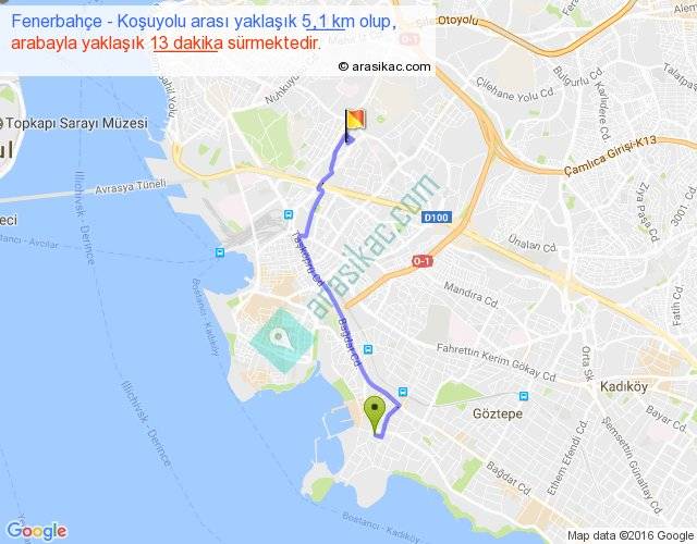 Fenerbahçe - Koşuyolu arası yaklaşık olarak 90 km/h ile yukarıda belirtilen sürede olup, iki yerin kuş uçuşu uzaklığı (mesafesi) 4'dir. Yolculuk otobüsle 16 dakika sürmektedir.
