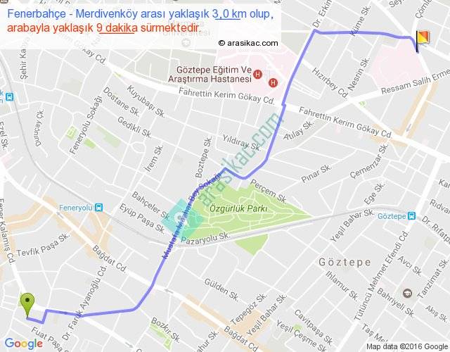 Fenerbahçe - Merdivenköy arası yaklaşık olarak 90 km/h ile yukarıda belirtilen sürede olup, iki yerin kuş uçuşu uzaklığı (mesafesi) 2'dir. Yolculuk otobüsle 11 dakika sürmektedir.