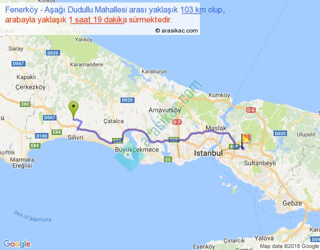 Fenerköy - Aşağı Dudullu Mahallesi arası yaklaşık olarak 90 km/h ile yukarıda belirtilen sürede olup, iki yerin kuş uçuşu uzaklığı (mesafesi) 79'dir. Yolculuk otobüsle 1 saat 42 dakika sürmektedir.