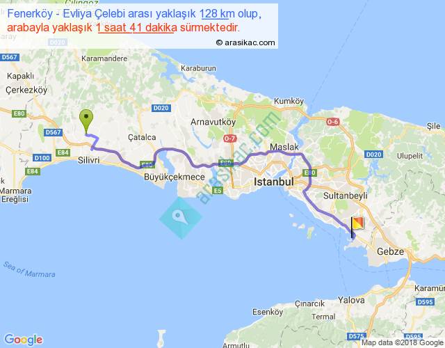 Fenerköy - Evliya Çelebi arası yaklaşık olarak 90 km/h ile yukarıda belirtilen sürede olup, iki yerin kuş uçuşu uzaklığı (mesafesi) 94'dir. Yolculuk otobüsle 2 saat 11 dakika sürmektedir.