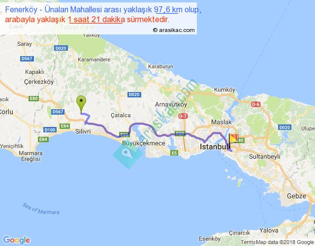 Fenerköy - Ünalan Mahallesi arası yaklaşık olarak 90 km/h ile yukarıda belirtilen sürede olup, iki yerin kuş uçuşu uzaklığı (mesafesi) 71'dir. Yolculuk otobüsle 1 saat 45 dakika sürmektedir.