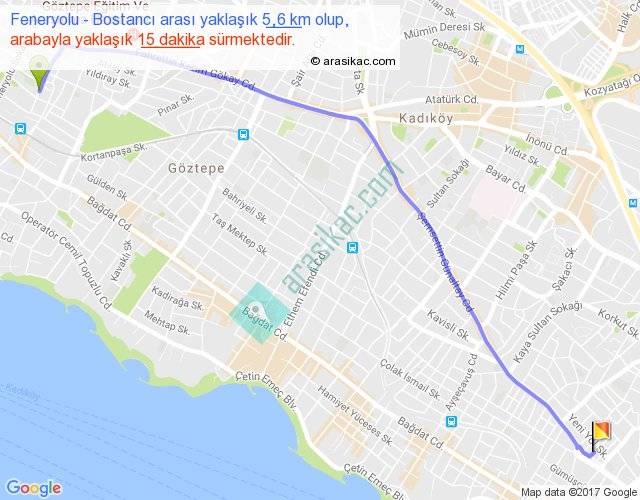 Feneryolu - Bostancı arası yaklaşık olarak 90 km/h ile yukarıda belirtilen sürede olup, iki yerin kuş uçuşu uzaklığı (mesafesi) 5'dir. Yolculuk otobüsle 19 dakika sürmektedir.