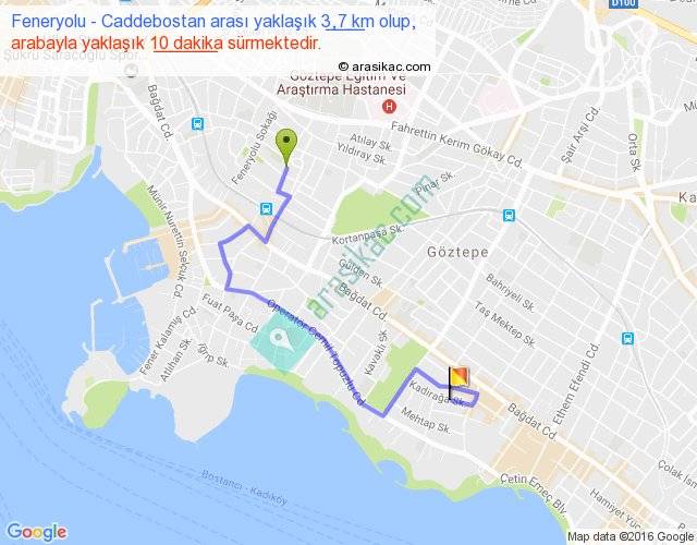 Feneryolu - Caddebostan arası yaklaşık olarak 90 km/h ile yukarıda belirtilen sürede olup, iki yerin kuş uçuşu uzaklığı (mesafesi) 2'dir. Yolculuk otobüsle 13 dakika sürmektedir.