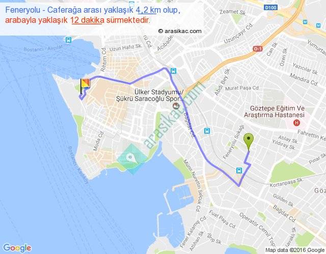 Feneryolu - Caferağa arası yaklaşık olarak 90 km/h ile yukarıda belirtilen sürede olup, iki yerin kuş uçuşu uzaklığı (mesafesi) 2'dir. Yolculuk otobüsle 15 dakika sürmektedir.