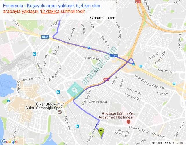 Feneryolu - Koşuyolu arası yaklaşık olarak 90 km/h ile yukarıda belirtilen sürede olup, iki yerin kuş uçuşu uzaklığı (mesafesi) 3'dir. Yolculuk otobüsle 15 dakika sürmektedir.