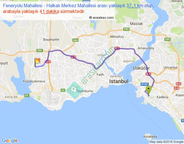 Feneryolu Mahallesi - Halkalı Merkez Mahallesi arası yaklaşık olarak 90 km/h ile yukarıda belirtilen sürede olup, iki yerin kuş uçuşu uzaklığı (mesafesi) 23'dir. Yolculuk otobüsle 53 dakika sürmektedir.