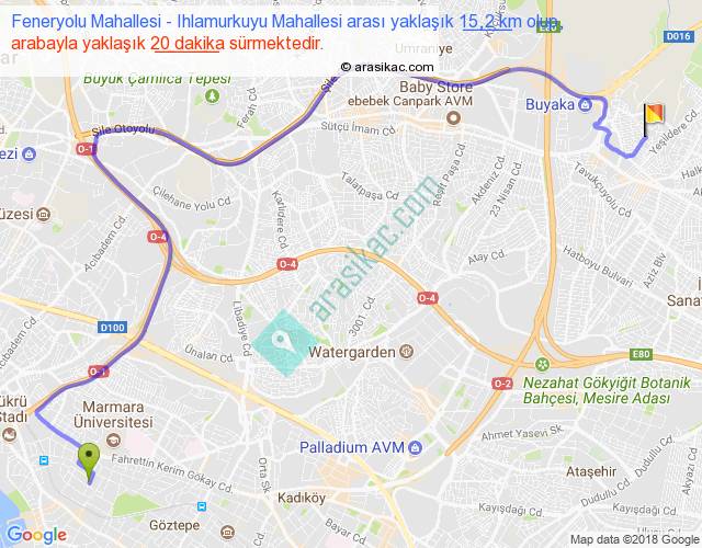 Feneryolu Mahallesi - Ihlamurkuyu Mahallesi arası yaklaşık olarak 90 km/h ile yukarıda belirtilen sürede olup, iki yerin kuş uçuşu uzaklığı (mesafesi) 9'dir. Yolculuk otobüsle 26 dakika sürmektedir.