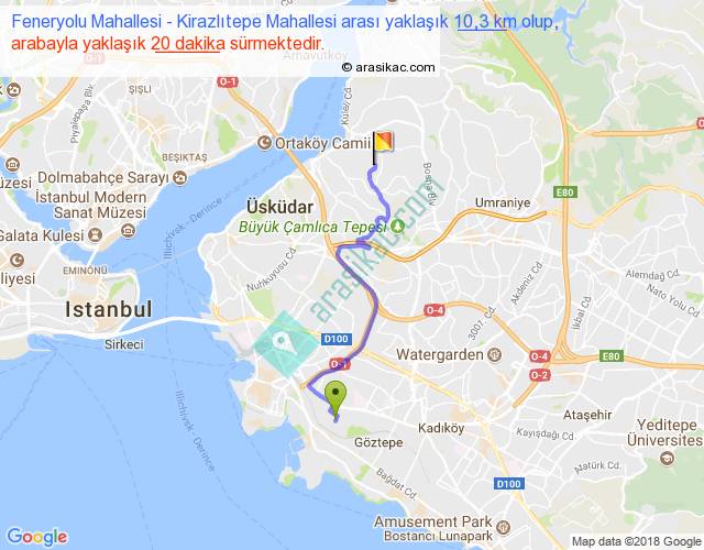 Eğer Feneryolu Mahallesi Kirazlıtepe Mahallesi arası ne kadar yakar (benzin/mazot) diyorsanız, kilometrede 3 ₺ yakan bir aracınız var ise 30, km'de 4 ₺ yakan bir aracınız var ise 40, km'de 5 ₺ yakan bir aracınız var ise 50 ile bu yolculuğu tamamlayabilirsiniz.