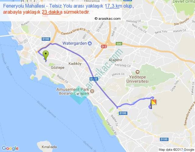 Feneryolu Mahallesi - Telsiz Yolu arası yaklaşık olarak 90 km/h ile yukarıda belirtilen sürede olup, iki yerin kuş uçuşu uzaklığı (mesafesi) 11'dir. Yolculuk otobüsle 29 dakika sürmektedir.