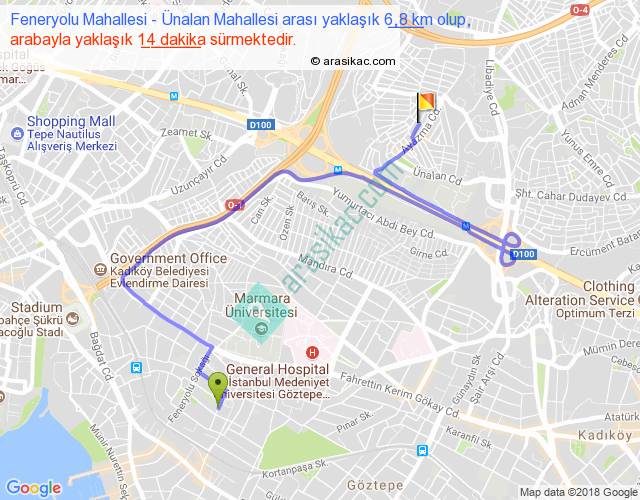 Feneryolu Mahallesi - Ünalan Mahallesi arası yaklaşık olarak 90 km/h ile yukarıda belirtilen sürede olup, iki yerin kuş uçuşu uzaklığı (mesafesi) 2'dir. Yolculuk otobüsle 18 dakika sürmektedir.