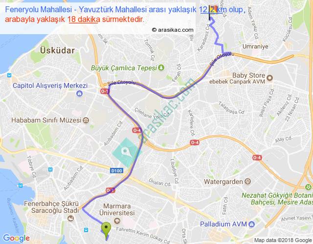 Feneryolu Mahallesi - Yavuztürk Mahallesi arası yaklaşık olarak 90 km/h ile yukarıda belirtilen sürede olup, iki yerin kuş uçuşu uzaklığı (mesafesi) 7'dir. Yolculuk otobüsle 23 dakika sürmektedir.