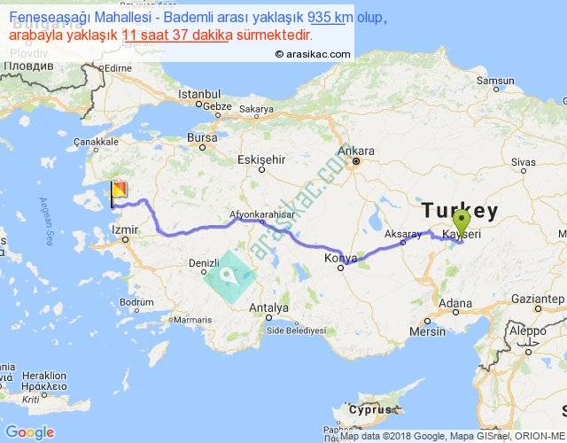 Feneseaşağı Mahallesi - Bademli arası yaklaşık olarak 90 km/h ile yukarıda belirtilen sürede olup, iki yerin kuş uçuşu uzaklığı (mesafesi) 751'dir. Eğer belirtilen yerler arasında uçak seferi var ise bu süre uçakla 1 saat 09 dakika'ya kadar düşebilir. Yolculuk otobüsle 15 saat 6 dakika sürmektedir.