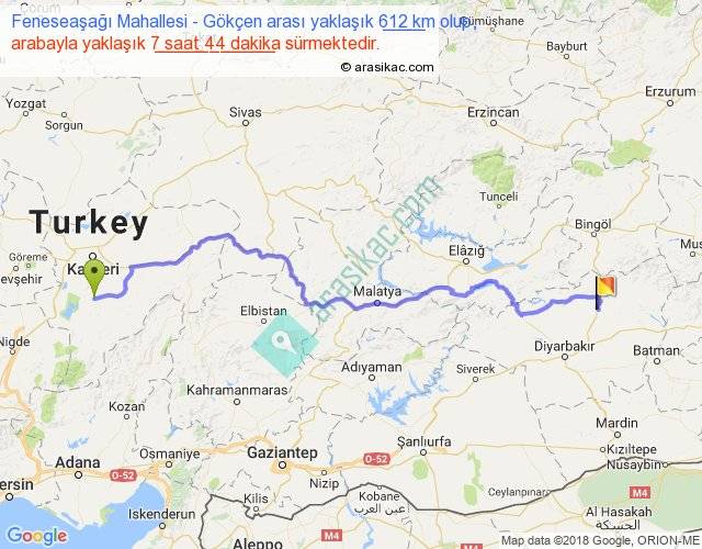 Feneseaşağı Mahallesi - Gökçen arası yaklaşık olarak 90 km/h ile yukarıda belirtilen sürede olup, iki yerin kuş uçuşu uzaklığı (mesafesi) 438'dir. Eğer belirtilen yerler arasında uçak seferi var ise bu süre uçakla 40 dakika'ya kadar düşebilir. Yolculuk otobüsle 10 saat 3 dakika sürmektedir.