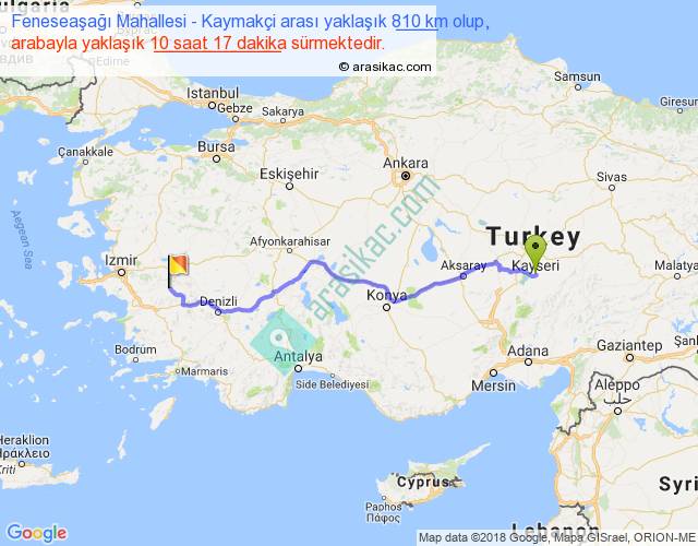 Feneseaşağı Mahallesi - Kaymakçi arası yaklaşık olarak 90 km/h ile yukarıda belirtilen sürede olup, iki yerin kuş uçuşu uzaklığı (mesafesi) 640'dir. Eğer belirtilen yerler arasında uçak seferi var ise bu süre uçakla 59 dakika'ya kadar düşebilir. Yolculuk otobüsle 13 saat 22 dakika sürmektedir.