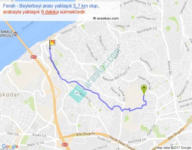 Ferah - Beylerbeyi arası yaklaşık olarak 90 km/h ile yukarıda belirtilen sürede olup, iki yerin kuş uçuşu uzaklığı (mesafesi) 2'dir. Yolculuk otobüsle 11 dakika sürmektedir.