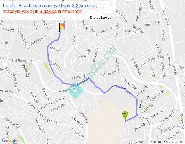 Ferah - Kirazlıtepe arası yaklaşık olarak 90 km/h ile yukarıda belirtilen sürede olup, iki yerin kuş uçuşu uzaklığı (mesafesi) 1'dir. Yolculuk otobüsle 10 dakika sürmektedir.