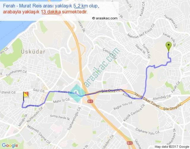 Ferah - Murat Reis arası yaklaşık olarak 90 km/h ile yukarıda belirtilen sürede olup, iki yerin kuş uçuşu uzaklığı (mesafesi) 4'dir. Yolculuk otobüsle 16 dakika sürmektedir.
