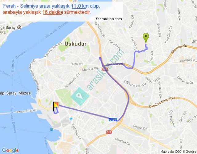 Ferah - Selimiye arası yaklaşık olarak 90 km/h ile yukarıda belirtilen sürede olup, iki yerin kuş uçuşu uzaklığı (mesafesi) 5'dir. Yolculuk otobüsle 20 dakika sürmektedir.