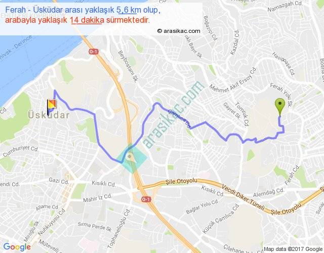 Ferah - Üsküdar arası yaklaşık olarak 90 km/h ile yukarıda belirtilen sürede olup, iki yerin kuş uçuşu uzaklığı (mesafesi) 3'dir. Yolculuk otobüsle 18 dakika sürmektedir.