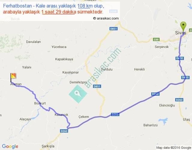 Ferhatbostan - Kale arası yaklaşık olarak 90 km/h ile yukarıda belirtilen sürede olup, iki yerin kuş uçuşu uzaklığı (mesafesi) 70'dir. Yolculuk otobüsle 1 saat 55 dakika sürmektedir.