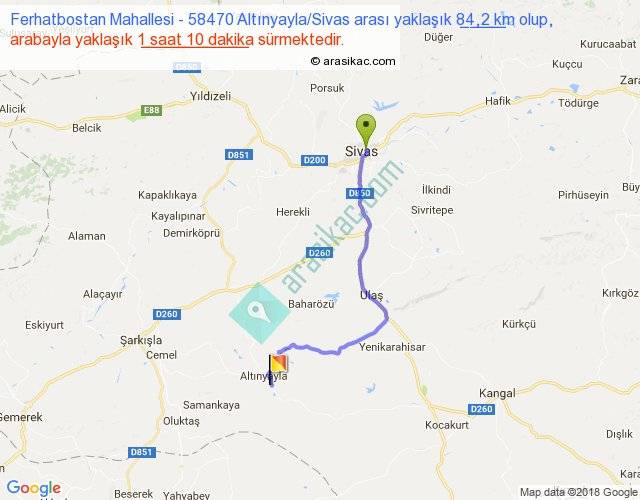 Ferhatbostan Mahallesi - 58470 Altınyayla Sivas arası yaklaşık olarak 90 km/h ile yukarıda belirtilen sürede olup, iki yerin kuş uçuşu uzaklığı (mesafesi) 59'dir. Yolculuk otobüsle 1 saat 31 dakika sürmektedir.