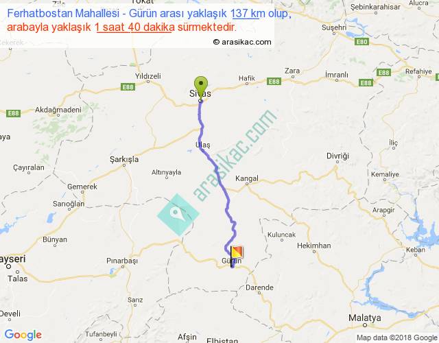 Ferhatbostan Mahallesi - Gürün arası yaklaşık olarak 90 km/h ile yukarıda belirtilen sürede olup, iki yerin kuş uçuşu uzaklığı (mesafesi) 116'dir. Yolculuk otobüsle 2 saat 10 dakika sürmektedir.