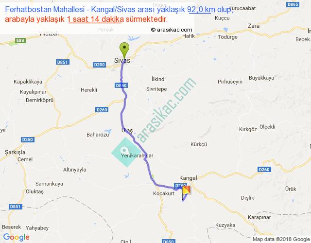 Ferhatbostan Mahallesi - Kangal Sivas arası yaklaşık olarak 90 km/h ile yukarıda belirtilen sürede olup, iki yerin kuş uçuşu uzaklığı (mesafesi) 73'dir. Yolculuk otobüsle 1 saat 36 dakika sürmektedir.