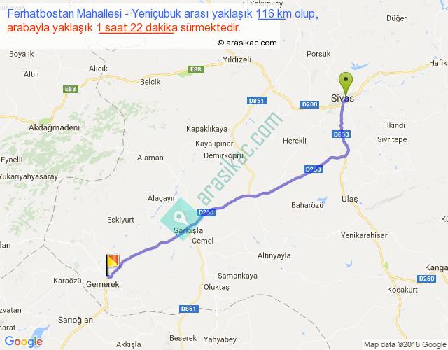 Ferhatbostan Mahallesi - Yeniçubuk arası yaklaşık olarak 90 km/h ile yukarıda belirtilen sürede olup, iki yerin kuş uçuşu uzaklığı (mesafesi) 100'dir. Yolculuk otobüsle 1 saat 46 dakika sürmektedir.