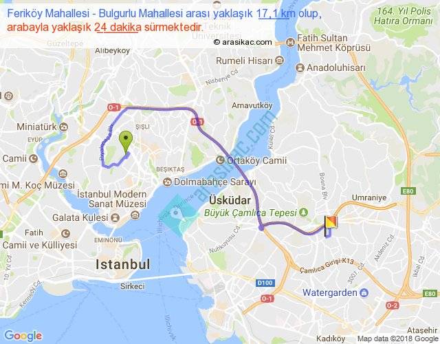 Feriköy Mahallesi - Bulgurlu Mahallesi arası yaklaşık olarak 90 km/h ile yukarıda belirtilen sürede olup, iki yerin kuş uçuşu uzaklığı (mesafesi) 9'dir. Yolculuk otobüsle 31 dakika sürmektedir.