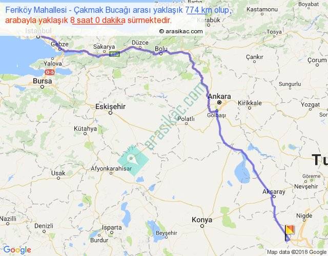 Feriköy Mahallesi - Çakmak Bucağı arası yaklaşık olarak 90 km/h ile yukarıda belirtilen sürede olup, iki yerin kuş uçuşu uzaklığı (mesafesi) 591'dir. Eğer belirtilen yerler arasında uçak seferi var ise bu süre uçakla 54 dakika'ya kadar düşebilir. Yolculuk otobüsle 10 saat 24 dakika sürmektedir.