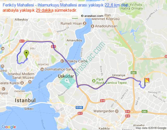 Feriköy Mahallesi - Ihlamurkuyu Mahallesi arası yaklaşık olarak 90 km/h ile yukarıda belirtilen sürede olup, iki yerin kuş uçuşu uzaklığı (mesafesi) 13'dir. Yolculuk otobüsle 37 dakika sürmektedir.