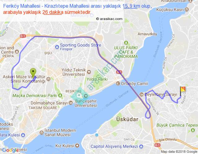 Feriköy Mahallesi - Kirazlıtepe Mahallesi arası yaklaşık olarak 90 km/h ile yukarıda belirtilen sürede olup, iki yerin kuş uçuşu uzaklığı (mesafesi) 7'dir. Yolculuk otobüsle 33 dakika sürmektedir.