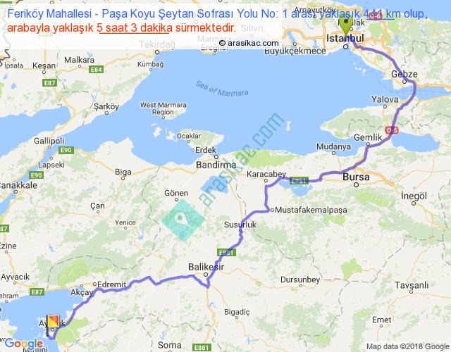 Feriköy Mahallesi - Paşa Koyu Şeytan Sofrası Yolu No: 1 arası yaklaşık olarak 90 km/h ile yukarıda belirtilen sürede olup, iki yerin kuş uçuşu uzaklığı (mesafesi) 277'dir. Eğer belirtilen yerler arasında uçak seferi var ise bu süre uçakla 25 dakika'ya kadar düşebilir. Yolculuk otobüsle 6 saat 33 dakika sürmektedir.