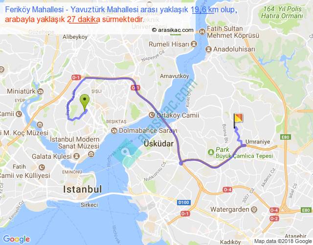 Feriköy Mahallesi - Yavuztürk Mahallesi arası yaklaşık olarak 90 km/h ile yukarıda belirtilen sürede olup, iki yerin kuş uçuşu uzaklığı (mesafesi) 9'dir. Yolculuk otobüsle 35 dakika sürmektedir.
