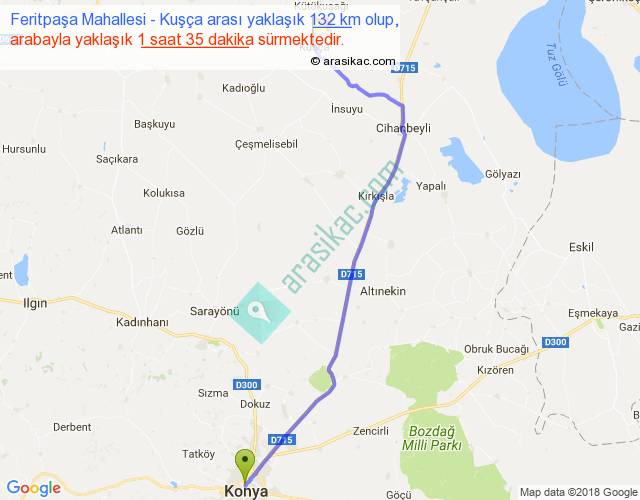 Feritpaşa Mahallesi - Kuşça arası yaklaşık olarak 90 km/h ile yukarıda belirtilen sürede olup, iki yerin kuş uçuşu uzaklığı (mesafesi) 106'dir. Yolculuk otobüsle 2 saat 3 dakika sürmektedir.