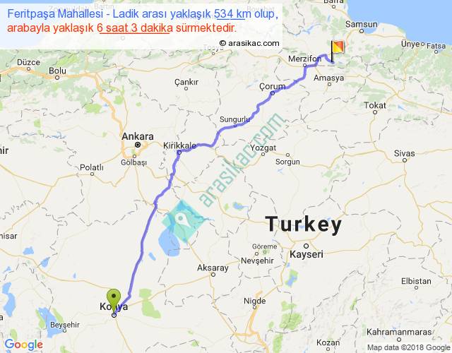Feritpaşa Mahallesi - Ladik arası yaklaşık olarak 90 km/h ile yukarıda belirtilen sürede olup, iki yerin kuş uçuşu uzaklığı (mesafesi) 443'dir. Eğer belirtilen yerler arasında uçak seferi var ise bu süre uçakla 40 dakika'ya kadar düşebilir. Yolculuk otobüsle 7 saat 51 dakika sürmektedir.