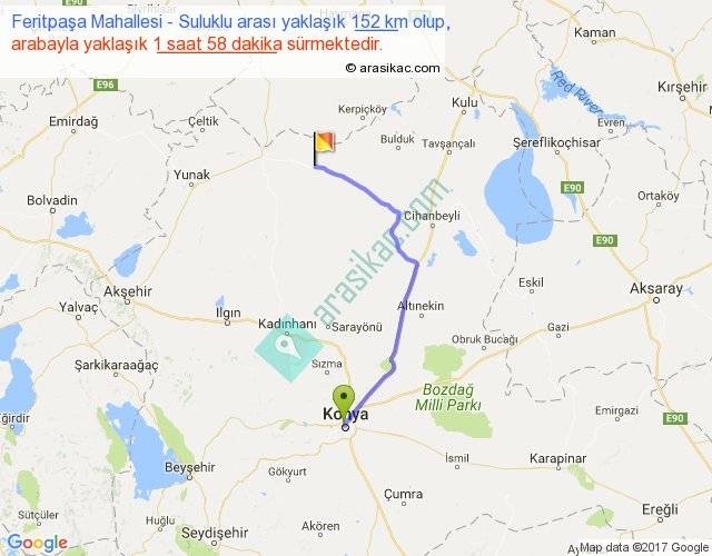 Eğer Feritpaşa Mahallesi Suluklu arası ne kadar yakar (benzin/mazot) diyorsanız, kilometrede 3 ₺ yakan bir aracınız var ise 456, km'de 4 ₺ yakan bir aracınız var ise 608, km'de 5 ₺ yakan bir aracınız var ise 760 ile bu yolculuğu tamamlayabilirsiniz.