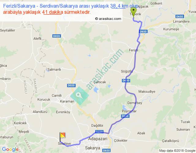 Ferizli Sakarya - Serdivan Sakarya arası yaklaşık olarak 90 km/h ile yukarıda belirtilen sürede olup, iki yerin kuş uçuşu uzaklığı (mesafesi) 27'dir. Yolculuk otobüsle 53 dakika sürmektedir.