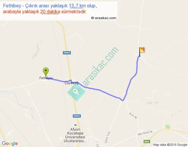Fethibey - Çıkrık arası yaklaşık olarak 90 km/h ile yukarıda belirtilen sürede olup, iki yerin kuş uçuşu uzaklığı (mesafesi) 10'dir. Yolculuk otobüsle 26 dakika sürmektedir.