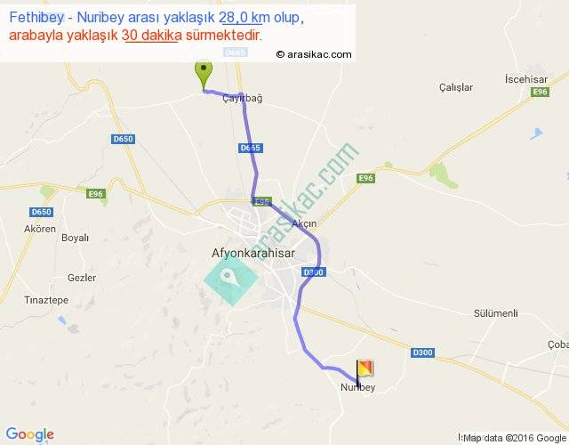 Fethibey - Nuribey arası yaklaşık olarak 90 km/h ile yukarıda belirtilen sürede olup, iki yerin kuş uçuşu uzaklığı (mesafesi) 22'dir. Yolculuk otobüsle 39 dakika sürmektedir.