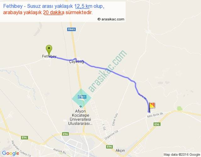 Fethibey - Susuz arası yaklaşık olarak 90 km/h ile yukarıda belirtilen sürede olup, iki yerin kuş uçuşu uzaklığı (mesafesi) 11'dir. Yolculuk otobüsle 26 dakika sürmektedir.