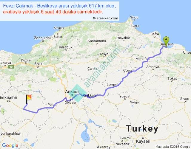 Fevzi Çakmak - Beylikova arası yaklaşık olarak 90 km/h ile yukarıda belirtilen sürede olup, iki yerin kuş uçuşu uzaklığı (mesafesi) 465'dir. Eğer belirtilen yerler arasında uçak seferi var ise bu süre uçakla 42 dakika'ya kadar düşebilir. Yolculuk otobüsle 8 saat 40 dakika sürmektedir.