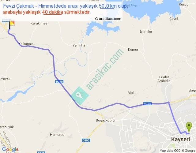 Fevzi Çakmak - Himmetdede arası yaklaşık olarak 90 km/h ile yukarıda belirtilen sürede olup, iki yerin kuş uçuşu uzaklığı (mesafesi) 40'dir. Yolculuk otobüsle 52 dakika sürmektedir.
