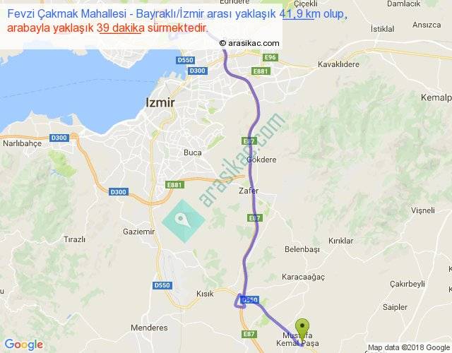 Fevzi Çakmak Mahallesi - Bayraklı İzmir arası yaklaşık olarak 90 km/h ile yukarıda belirtilen sürede olup, iki yerin kuş uçuşu uzaklığı (mesafesi) 29'dir. Yolculuk otobüsle 50 dakika sürmektedir.