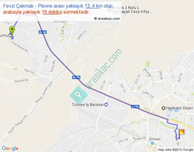 Fevzi Çakmak - Plevne arası yaklaşık olarak 90 km/h ile yukarıda belirtilen sürede olup, iki yerin kuş uçuşu uzaklığı (mesafesi) 9'dir. Yolculuk otobüsle 20 dakika sürmektedir.