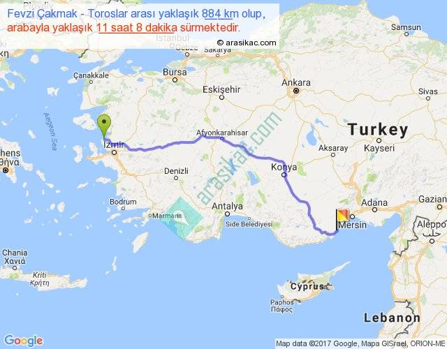 Fevzi Çakmak - Toroslar arası yaklaşık olarak 90 km/h ile yukarıda belirtilen sürede olup, iki yerin kuş uçuşu uzaklığı (mesafesi) 689'dir. Eğer belirtilen yerler arasında uçak seferi var ise bu süre uçakla 1 saat 03 dakika'ya kadar düşebilir. Yolculuk otobüsle 14 saat 28 dakika sürmektedir.