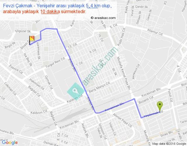 Fevzi Çakmak - Yenişehir arası yaklaşık olarak 90 km/h ile yukarıda belirtilen sürede olup, iki yerin kuş uçuşu uzaklığı (mesafesi) 4'dir. Yolculuk otobüsle 13 dakika sürmektedir.